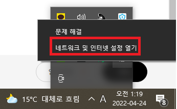 1. 먼저 우측 하단 네트워크 아이콘에서 오른쪽 마우스 클릭하여 네트워크 및 인터넷 설정 열기를 클릭해줍니다.